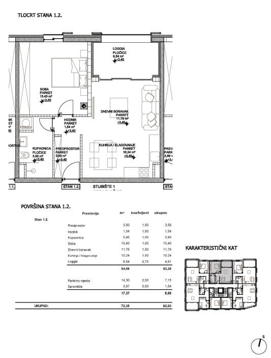 Apartment with a total net usable area of 62.03 m² – including anteroom 3.5 m², hallway 1.54 m², bathroom 5.95 m², bedroom 15.45 m², living room 11.76 m², kitchen with dining area 10.24 m², loggia 4.91 m², parking space 7.15 m², and storage 1.54 m².